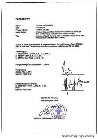Chistianto, Felix (2023) Analisis keausan mata pahat pasca pembubutan baja aisi 4140 dengan variasi grade insert carbide (TM - 1338). Skripsi thesis, Universitas Tarumanagara.