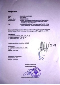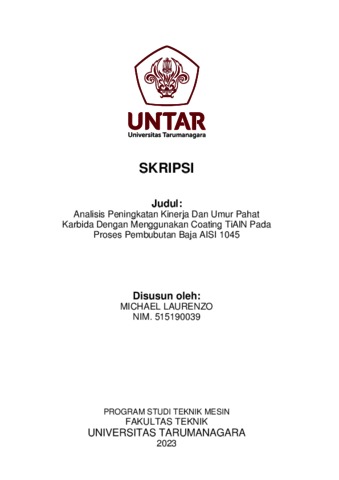 Laurenzo, Michael (2023) Analisis peningkatan kinerja dan umur pahat karbida dengan menggunakan coating tialn pada proses pembubutan baja aisi 1045 (TM - 1344). Skripsi thesis, Universitas Tarumanagara.