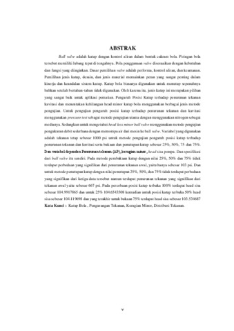 Ball valve adalah katup dengan kontrol aliran dalam bentuk cakram bola. Piringan bola tersebut memiliki lubang tepat di tengahnya. Pola penggunaan valve disesuaikan dengan kebutuhan dan fungsi yang diinginkan. Dasar pemilihan valve adalah performa, kontrol aliran, dan keamanan. Pemilihan jenis katup, desain, dan jenis material memainkan peran yang sangat penting dalam kinerja dan keandalan sistem katup. Katup bola biasanya digunakan untuk menutup sepenuhnya bahkan setelah bertahun-tahun tidak digunakan. Oleh karena itu, jenis katup ini merupakan pilihan yang sangat baik untuk aplikasi pematian. Pengaruh Posisi Katup terhadap penurunan tekanan kavitasi dan menentukan kehilangan head minor katup bola menggunakan berbagai jenis metode pengujian. Untuk pengujian pengaruh posisi katup terhadap penurunan tekanan dan kavitasi menggunakan pressure test sebagai metode pengujian utama dengan menggunakan nitrogen sebagai medianya. Sedangkan untuk mengetahui head loss minor ball valve menggunakan metode pengujian pengukuran debit sederhana dengan memompa air dari mesin ke ball valve. Variabel yang digunakan adalah tekanan tetap sebesar 1000 psi untuk metode pengujian pengaruh posisi katup terhadap penurunan tekanan dan kavitasi serta bukaan dan penutupan katup sebesar 25%, 50%, 75 dan 75%. Dan variabel dependen Penurunan tekanan (∆P), kerugian minor, head sisa pompa. Dan spesifikasi dari ball valve itu sendiri. Pada metode pembukaan katup dengan nilai 25%, 50% dan 75% tidak terdapat perbedaan yang signifikan dari penurunan tekanan awal, yaitu hanya sebesar 103 psi. Dan untuk metode penutupan katup dengan nilai penutupan 25%, 50%, dan 75% tidak terdapat perbedaan yang signifikan dari ketiga data tersebut namun terdapat penurunan tekanan yang signifikan dari tekanan awal yaitu sebesar 667 psi. Pada percobaan posisi katup terbuka 100% terdapat head sisa sebesar 104.9917865 dan untuk 25% 104.6543508 kemudian untuk posisi katup terbuka 50% head sisa sebesar 104.119698 dan yang terakhir untuk bukaan 75% terdapat head sisa sebesar 103.534687 Kata Kunci : Katup Bola , Pengurangan Tekanan, Kerugian Minor, Distribusi Tekanan