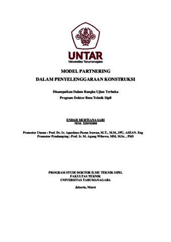 Sari, Endah Murtiana (2023) Model partnering dalam penyelenggaraan konstruksi. Doctoral thesis, Universitas Tarumanagara.