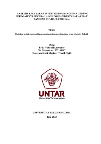 Luswanto, Evik Wahyudi (2023) Analisis kelayakan investasi pembangunan gedung sekolah xyz secara langsung dan bertahap akibat pandemi covid-19 (corona). Masters thesis, Universitas Tarumanagara.