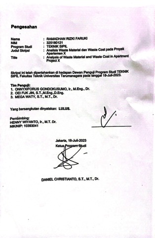 Faruki, Ramadhan Rizki (2023) Analisis waste material dan waste cost pada proyek apartemen x. Skripsi thesis, Universitas Tarumanagara.