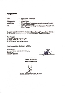 Eppendie, Agustinus (2023) Optimasi biaya penggunaan dump truck pada proyek x dengan program solver. Skripsi thesis, Universitas Tarumanagara.