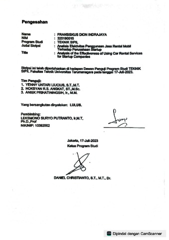 Indrajaya, Fransiskus Dion (2023) Analisis efektivitas penggunaan jasa rental mobil terhadap perusahaan startup. Skripsi thesis, Universitas Tarumanagara.