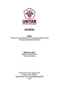 Christian, Marco (2023) Pengaruh penambahan abu cangkang kelapa sawit terhadap sifat mekanis beton. Skripsi thesis, Universitas Tarumanagara.