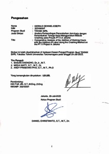 Joseph, Gerald Dennis (2023) Analisis perbandingan penambahan jam kerja dengan penambahan tenaga kerja menggunakan metode crashing pada proyek pt x di Jakarta. Skripsi thesis, Universitas Tarumanagara.