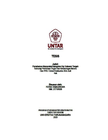 Tamagangka, Ferna (2023) Pemahaman Masyarakat Kabupaten Sigi Sulawesi Tengah Terhadap Perbedaan Tugas Dan Kewenangan Notaris Dan PPAT Dalam Pembuatan Akta Jual Beli. Masters thesis, Universitas Tarumanagara.