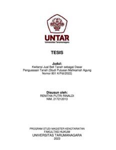 Rinaldi, Renitha Putri (2023) Kwitansi Jual Beli Tanah sebagai Dasar Penguasaan Tanah (Studi Putusan Mahkamah Agung Nomor 801 K/Pdt/2022). Masters thesis, Universitas Tarumanagara.