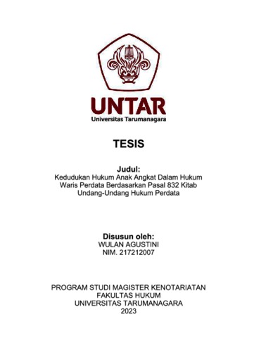 Agustini, Wulan (2023) Kedudukan Hukum Anak Angkat Dalam Hukum Waris Perdata Berdasarkan Pasal 832 Kitab Undang-Undang Hukum Perdata. Masters thesis, Universitas Tarumanagara.