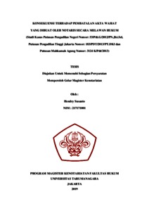 | Uncontrolled Keywords: | Konsekuensi, Pembatalan Akta Otentik, Notaris, Perbuatan Melawan Hukum |