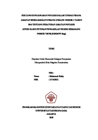 Rizky, Muhamad (2020) Pertanggungjawaban Notaris Dalam Tindak Pidana Jabatan Berdasarkan Undang-Undang Nomor 2 Tahun 2014 Tentang Peraturan Jabatan Notaris (Studi Kasus Putusan Pengadilan Negeri Semarang Nomor 738/Pid.B/2018/Pn Smg). Masters thesis, Universitas Tarumanagara.
