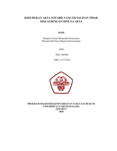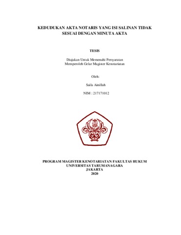 Ainillah, Saila (2020) Kedudukan Akta Notaris Yang Isi Salinan Tidak Sesuai Dengan Minuta Akta. Masters thesis, Universitas Tarumanagara.
