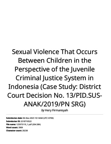 Sexual Violence That Occurs Between Children in the Perspective of the Juvenile Criminal Justice System in Indonesia (Case Study_ District Court Decision No. 13_PID.SUS-ANAK_2019_PN SRG) (1).pdf Download (1MB) | Preview |