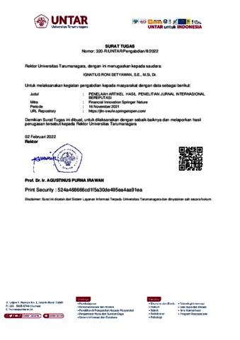 ignatius roni, Bukti Kinerja (2022) Bukti Kinerja Reviewer Jurnal Financial Innovation Springer (Q1)-OKE. Bukti Kinerja Reviewer Jurnal Financial Innovation Springer (Q1)-OKE.