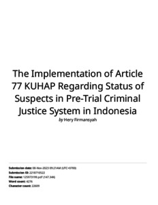Fernando Tumbur Josua Napitupulu, Pertama and Hery Firmansyah, Kedua Turnitin "The Implementation of Article 77 KUHAP Regarding Status of Suspects in Pre-Trial Criminal Justice System in Indonesia". Turnitin "The Implementation of Article 77 KUHAP Regarding Status of Suspects in Pre-Trial Criminal Justice System in Indonesia".