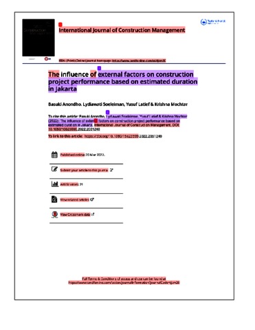 Basuki Anondho, Pertama The Influence of External Factors on Construction Project Performance Based on Estimated Duration in Jakarta. The Influence of External Factors on Construction Project Performance Based on Estimated Duration in Jakarta.