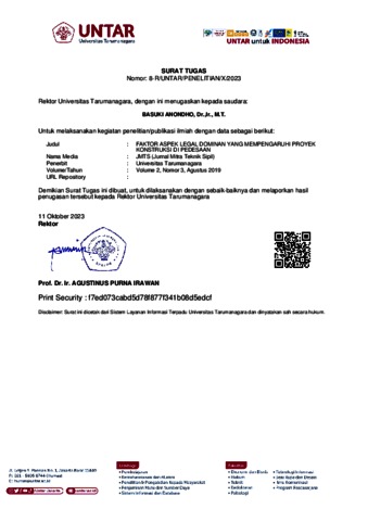 Anondho, Basuki FAKTOR ASPEK LEGAL DOMINAN YANG MEMPENGARUHI PROYEK KONSTRUKSI DI PEDESAAN. JMTS (Jurnal Mitra Teknik Sipil).