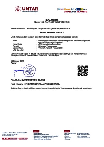 Anondho, Basuki Perbandingan Perhitungan Volume Pekerjaan dak beton bertulang antara metode BIM dengan Konvensional. JMTS (Jurnal Mitra Teknik Sipil).