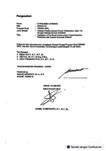 Chrisna, Chraladea (2023) Validasi prediksi durasi proyek infrastruktur jalan tol dengan metode earned schedule. Skripsi thesis, Universitas Tarumanagara.