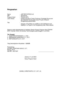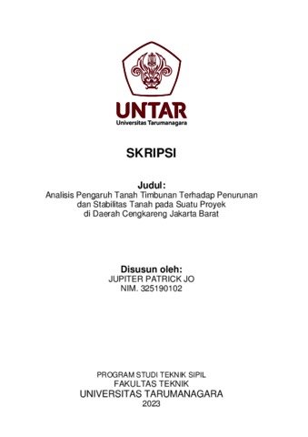 Jo, Jupiter Patrick (2023) Analisis pengaruh tanah timbunan terhadap penurunan dan stabilitas tanah pada suatu proyek di daerah Cengkareng Jakarta Barat. Skripsi thesis, Universitas Tarumanagara.