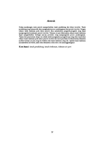 Dalam membangun suatu proyek memperhatikan tanah pendukung dari lokasi tersebut. Tanahpendukung yang bermasalah akan menghambat proses pembangunan dari proyek tersebut. Denganadanya tanah timbunan pada lokasi proyek akan memberikan pengaruh-pengaruh yang dapat mempengaruhi berjalannya proyek tersebut. Tekanan air pori dikarenakan adanya tanah timbunandapat mengakibatkan berbagai macam peristiwa yang mempengaruhi proses pembangunan. Tujuan dari penyusunan skripsi ini adalah untuk menganalisis pengaruh apa yang akan terjadi dari adanya tanah timbunan pada lokasi proyek tersebut dari hasil penelitian di laboratoriumditambahmelihat tekanan air pori yang di sebabkan dari tanah timbunan yang ada. Apabila tanah timbunanmenimbulkan hal buruk, maka akan ditemukan solusi atau cara menanggulanginya. Kata kunci: tanah pendukung, tanah timbunan, tekanan air pori