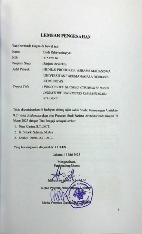 Rahayuningtyas, Budi (2023) Hunian produktif: asrama mahasiswa universitas tarumanagara berbasis komunitas. Skripsi thesis, Universitas Tarumanagara.