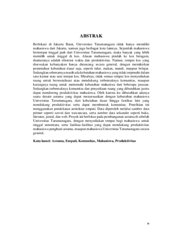 Berlokasi di Jakarta Barat, Universitas Tarumanagara tidak hanya memiliki mahasiswa dari Jakarta, namun juga berbagai kota lainnya. Sejumlah mahasiswa bertempat tinggal jauh dari Universitas Tarumanagara, maka banyak yang lebih memilih untuk tinggal di kos. Alasan mahasiswa pindah ke kos beragam, diantaranya adalah efisiensi waktu dan produktivitas. Namun, tempat kos yang disewakan kebanyakan hanya dirancang secara general, dengan memikirkan pemenuhan kebutuhan dasar saja, seperti tidur, makan, mandi, maupun belajar. Sedangkan sebenarnya masih ada kebutuhan mahasiswa yang tidak terpenuhi dalam satu kamar atau satu tempat kos. Misalnya, tidak semua tempat kos menyediakan ruang untuk bersosialisasi atau mendukung terbentuknya komunitas, maupun kurangnya ruang untuk memenuhi kebutuhan mahasiwa dari beberapa jurusan. Sedangkan terbentuknya komunitas dan penyediaan ruang yang dibutuhkan justru dapat mendorong produktivitas mahasiswa. Oleh karena itu dibutuhkan adanya suatu desain asrama yang dapat menyesuaikan dengan kebutuhan mahasiswa Universitas Tarumanagara, dari kebutuhan dasar hingga fasilitas lain yang mendukung produktivitas serta dapat membentuk komunitas. Penelitian ini menggunakan pendekatan arsitektur empati. Data diperoleh melalui sumber data primer seperti survei dan wawancara, serta sumber data sekunder seperti buku, literatur, jurnal, dan web. Proyek ini berfokus pada pembangunan asrama di sebelah Universitas Tarumanagara, dengan menyediakan tempat bagi mahasiswa untuk tinggal sementara, serta fasilitas-fasilitas yang dapat mendukung produktivitas mahasiswa penghuni asrama, maupun mahasiswa Universitas Tarumanagara secara