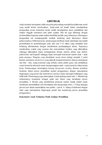 Anak terlantar merupakan salah satu jenis penyandang masalah kesejahteraan sosial yang masih belum terselesaikan. Anak–anak ini masih belum mendapatkan pengasuhan secara maksimal meski sudah mendapatkan akses pendidikan dan tempat singgah sementara dari panti asuhan. Hal ini juga didorong dengan permasalahan kapasitas panti asuhan melebihi jumlah yang seharusnya. Kurangnya pengasuhan ini mempengaruhi tumbuh kembang anak khususnya dalam psikososialnya. Oleh karena itu, perancangan ini dibuat untuk membantu mewadahi pertumbuhan & perkembangan anak dari usia 5-12 tahun yang memiliki latar belakang ditelantarkan dengan memberikan pendampingan intens. Tujuannya memberikan wadah yang nyaman dan menyediakan fasilitas yang dibutuhkan sehingga diharapkan dapat meningkatkan derajat mereka dalam segi afektif, psikososial, dan kognitif sehingga dapat mencapai kesetaraan seperti anak – anak pada umumya. Program yang disediakan secara besar terbagi menjadi 3 yakni hunian sementara (dormitory) yang dipisah menjadi dormitory khusus perempuan dan laki - laki, ruang komunal yang terbuka untuk public guna, dan pendidikan (semi-formal & informal) untuk mempersiapkan anak – anak masuk ke dalam dunia kerja. Peranacangan menerapkan konsep therapeutic healing dimana arsitektur berperan dalam proses pemulihan mental penggunanya dengan menciptakan lingkungan yang postif dan memotivasi usernya untuk mencapai kehidupan yang lebih baik. Perancangan juga menerapkan 4 poin penting antara lain; 1. Mendorong terbentuknya komunitas sebagai salah satu faktor yang membantu proses pemulihan, 2. Desain yang memberikan perasaan seperti rumah sendiri untuk membantu memudahkan user beradaptasi dan mengurangi stress, 3. Tetap menjaga privasi user denan memisahkan area public – privat. 4. Adanya kolaborasi dengan alam yang menciptakan lingkungan positif dan mendorong proses pemulihan penggunanya. Kata kunci: Anak Terlantar; Panti Asuhan; Pemulihan