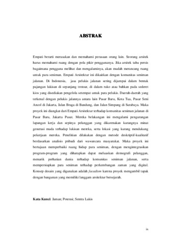 Empati berarti merasakan dan memahami perasaan orang lain. Seorang arsitek harus memahami ruang dengan pola pikir penggunanya. Jika arsitek tahu persis bagaimana pengguna melihat dan mengalaminya, akan mudah merancang ruang untuk para seniman. Empati Arsitektur ini dikaitkan dengan komunitas seniman jalanan. Di Indonesia, jasa pelukis jalanan sering dijumpai dalam bentuk pajangan lukisan di sepanjang trotoar, di dalam ruko atau bahkan pada sederet kios yang disediakan pengelola setempat untuk para pelukis. Daerah-daerah yang terkenal dengan pelukis jalannya antara lain Pasar Baru, Kota Tua, Pasar Seni Ancol di Jakarta, Jalan Braga di Bandung, dan Jalan Simpang di Surabaya. Maka proyek ini diangkat dari Empati Arsitektur terhadap komunitas seniman jalanan di Pasar Baru, Jakarta Pusat. Mereka belakangan ini mengalami pengurangan lapangan kerja dan sepinya pelanggan yang dikarenakan kurangnya minat generasi muda terhadap lukisan mereka, serta lokasi yang kurang mendukung pekerjaan mereka. Penelitian dilakukan dengan metode deskriptif-kualitatif berdasarkan analisis pribadi dari wawancara masyarakat. Maka proyek ini bertujuan memperbaiki ruang hidup para seniman, dengan mengintegrasikan program-program yang diharapkan dapat meluaskan demografi pelanggan, menarik perhatian dunia terhadap komunitas seniman jalanan, serta mempersiapkan para seniman terhadap perkembangan zaman yang digital. Konsep desain yang digunakan adalah facadism karena proyek mengambil tapak dengan bangunan yang memiliki langgam arsitektur bersejarah.