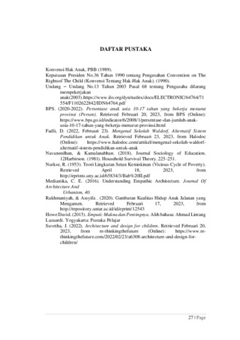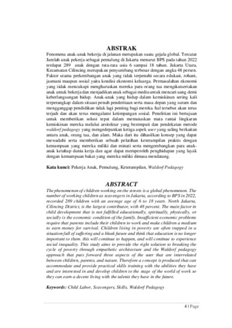 Fenomena anak-anak bekerja di jalanan merupakan suatu gejala global. Tercatat Jumlah anak pekerja sebagai pemulung di Jakarta menurut BPS pada tahun 2022 terdapat 289 anak dengan rata-rata usia 6 sampai 18 tahun. Jakarta Utara, Kecamatan Cilincing merupakan penyumbang terbesar dengan angka 48 persen. Faktor utama perkembangan anak yang tidak terpenuhi secara edukasi, rohani, jasmani maupun sosial yaitu kondisi ekonomi keluarga. Permasalahan ekonomi yang tidak mencukupi mengharuskan mereka para orang tua mengikutsertakan anak untuk bekerja dan menjadikan anak sebagai media untuk mencari uang demi keberlangsungan hidup. Anak-anak yang hidup dalam kemiskinan sering kali terperangkap dalam situasi penuh penderitaan serta masa depan yang suram dan mengganggap pendidikan tidak lagi penting bagi mereka. hal tersebut akan terus terjadi dan akan terus mengalami ketimpangan sosial. Penelitian ini bertujuan untuk memberikan solusi tepat dalam memutuskan mata rantai lingkaran kemiskinan mereka melalui arsitektur yang berempati dan pendekatan metode waldorf pedagogy yang mengedepankan ketiga aspek user yang saling berkaitan antara anak, orang tua, dan alam. Maka dari itu dihasilkan konsep yang dapat mewadahi serta memberikan sebuah pelatihan keterampilan praktis dengan kemampuan yang mereka miliki dan minati serta mengembangkan para anakanak ketahap dunia kerja dan agar dapat memperoleh penghidupan yang layak dengan kemampuan bakat yang mereka miliki dimasa mendatang. Kata kunci: Pekerja Anak, Pemulung, Keterampilan, Waldorf Pedagogy