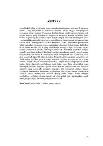 Masalah kelebihan berat badan terus mengalami peningkatan terutama di kalangan remaja yang menyebabkan penurunan kualitas hidup hingga mempengaruhi kehidupan sehari-harinya. Penurunan kualitas hidup cenderung disebabkan oleh stigma negatif yang tersebar di masyarakat mengenai remaja kelebihan berat badan. Stigma negatif tersebut dapat diubah dengan cara mengembangkan bakat yang dimilikinya melalui program kegiatan beserta elemen desain keruangan yang sesuai untuk meningkatkan kualitas hidupnya. Maka, dibutuhkan pemahaman lebih mendalam mengenai upaya peningkatan kualitas hidup remaja kelebihan berat badan melalui bakat yang dimilikinya sebagai empati terhadap stigma negatif masyarakat melalui rancangan arsitektur. Penelitian dilakukan dengan metode penelitian deskriptif kualitatif melalui pendekatan naratif yang ditunjang dengan observasi dan studi kepustakaan untuk memperoleh data. Kemudian, datadata yang telah diperoleh akan diuraikan dengan berpedoman pada kajian literatur. Hasil uraian terfokus pada 8 tahap program kegiatan berdasarkan bakat yang dimiliki subjek sebagai landasan merancang. Dengan melakukan penguraian lebih lanjut, dapat diperoleh pembahasan bakat-bakat yang dapat ditampilkan pada rancangan, tahapan program kegiatan secara runtun, ruangan atau area baru dan menarik yang mewadahi program kegiatan, dan penerapan elemen desain keruangan berdasarkan kebutuhan kegiatannya hingga tercapainya peningkatan kualitas hidup. Peningkatan kualitas hidup pada subjek utama menjadi pembuktian terhadap stigma negatif di masyarakat dan menandakan sudah terwujudnya empati dalam rancangan arsitektur ini. Kata kunci: bakat; berat; kualitas; ruang; stigma