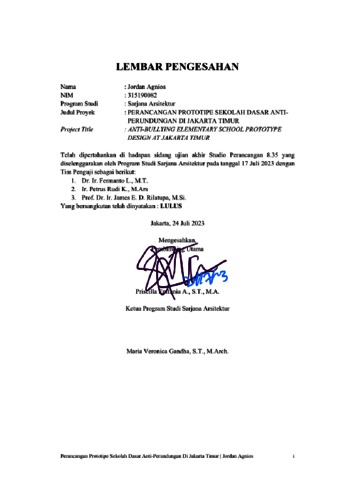 Agnios, Jordan (2023) Perancangan prototipe sekolah anti-perundungan di Jakarta Timur. Skripsi thesis, Universitas Tarumanagara.