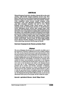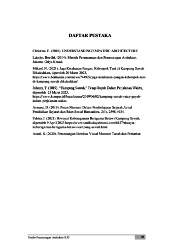Wilayah Kampung Sawah dulu wilayahnya ditutupi oleh sawah-sawah sekarang sudah berubah menjadi pemukiman mewah warga Kota Bekasi. Sejak dulu kawasan ini dikenal dengan hasil pertaniannya yang berpotensi sebagai mata pencaharian utama bagi penduduk setempat. Untuk menghindari potensi kawasan menjadi terlupakan seiring baerjalannya waktu, maka dibutuhkan membangun suatu bangunan yang dapat menyimpan pergerakan dari masa ke masa wilayah Kampung Sawah. Bangunan berupa sebuah museum yang berisi mengenai sejarah dan perkembangan pertanian di wilayah Kampung Sawah. Diharapakan proyek museum dapat menjadi tempat untuk menyimpan cerita perkembangan dan budaya wilayah Kampung Sawah dari masa ke masa, mengenang dan memperkenalkan potensi pertanian dan hasilnya serta mengenalkan pertanian di Kampung Sawah kepada generasi muda sebagai sarana potensi desa dan edukasi bagi masyarakat luas. Museum pertanian menjadi tempat untuk mempelajari sejarah pertanian Kampung Sawah, mulai dari alat pertanian tradisional hingga modern, metode teknik bercocok tanam, dll. Dalam jangka panjang, proyek Museum Pertanian Kampung Sawah dapat menjadi tempat wisata edukasi bagi masyarakat lokal dan juga luar daerah. Kata kunci: Kampung Sawah; Museum; pertanian; Petani