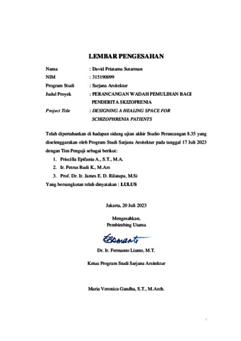 Sutarman, David Priatama (2023) Perancangan wadah pemulihan bagi penderita skizofrenia. Skripsi thesis, Universitas Tarumanagara.