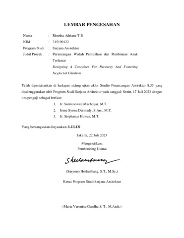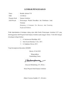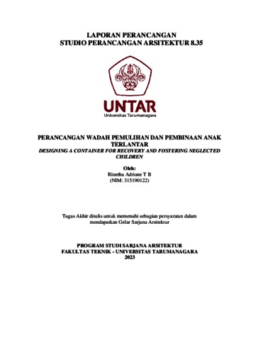 Budiarto, Rinetha Adriane Tsanynda (2023) Perancangan wadah pemulihan dan pembinaan anak terlantar. Skripsi thesis, Universitas Tarumanagara.