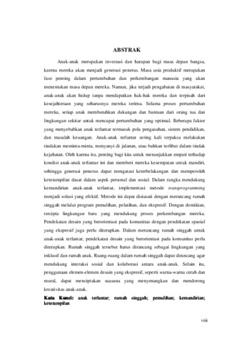 Anak-anak merupakan investasi dan harapan bagi masa depan bangsa, karena mereka akan menjadi generasi penerus. Masa usia produktif merupakan fase penting dalam pertumbuhan dan perkembangan manusia yang akan menentukan masa depan mereka. Namun, jika terjadi pengabaian di masyarakat, anak-anak akan hidup tanpa mendapatkan hak-hak mereka dan terpisah dari kesejahteraan yang seharusnya mereka terima. Selama proses pertumbuhan mereka, setiap anak membutuhkan dukungan dan bantuan dari orang tua dan lingkungan sekitar untuk mencapai pertumbuhan yang optimal. Beberapa faktor yang menyebabkan anak terlantar termasuk pola pengasuhan, sistem pendidikan, dan masalah keuangan. Anak-anak terlantar sering kali terpaksa melakukan tindakan meminta-minta, menyanyi di jalanan, atau bahkan terlibat dalam tindak kejahatan. Oleh karena itu, penting bagi kita untuk menunjukkan empati terhadap kondisi anak-anak terlantar ini dan memberi mereka kesempatan untuk mandiri, sehingga generasi penerus dapat mengatasi keterbelakangan dan memperoleh keterampilan dasar dalam aspek personal dan sosial. Dalam rangka mendukung kemandirian anak-anak terlantar, implementasi metode transprogramming menjadi solusi yang efektif. Metode ini dapat disiasati dengan merancang rumah singgah melalui program pemulihan, pelatihan, dan ekspresif. Dengan demikian, tercipta lingkungan baru yang mendukung proses perkembangan mereka. Pendekatan desain yang berorientasi pada komunitas dengan pendekatan spasial yang ekspresif juga perlu diterapkan. Dalam merancang rumah singgah untuk anak-anak terlantar, pendekatan desain yang berorientasi pada komunitas perlu diterapkan. Rumah singgah tersebut harus dirancang sebagai lingkungan yang inklusif dan ramah anak. Ruang-ruang dalam rumah singgah dapat dirancang agar mendukung interaksi sosial dan kolaborasi antara anak-anak. Selain itu, penggunaan elemen-elemen desain yang ekspresif, seperti warna-warna cerah dan mural, dapat menciptakan suasana yang menyenangkan dan mendorong