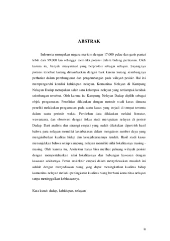 Indonesia merupakan negara maritim dengan 17.000 pulau dan garis pantai lebih dari 99.000 km sehingga memiliki potensi dalam bidang perikanan. Oleh karena itu, banyak masyarakat yang berprofesi sebagai nelayan. Sayangnya potensi tersebut kurang dimanfaatkan dengan baik karena kurang seimbangnya perhatian dalam pembangunan dan pengembangan pada wilayah pesisir. Hal ini mempengaruhi kondisi kehidupan nelayan. Komunitas Nelayan di Kampung Nelayan Dadap merupakan salah satu kelompok nelayan yang terdampak ketidak seimbangan tersebut. Oleh karena itu Kampung Nelayan Dadap dipilih sebagai objek pengamatan. Penelitian dilakukan dengan metode studi kasus dimana peneliti melakukan pengamatan pada suatu kasus yang terjadi di tempat tertentu dalam suatu periode waktu. Perolehan data dilakukan melalui literatur, wawancara, dan observasi dengan fokus studi merupakan nelayan di pesisir Dadap. Dari analisis dan strategi empati yang sudah dilakukan diperoleh hasil bahwa para nelayan memiliki keterbatasan dalam mengakses sumber daya yang mengakibatkan kualitas hidup dan kesejahteraannya rendah. Hasil studi kasus menunjukkan bahwa setiap kampung nelayan memiliki nilai lokalitasnya masing - masing. Oleh karena itu, Arsitektur harus bisa melihat peluang wilayah pesisir dengan mempertahankan nilai lokalitasnya dan hubungan kawasan dengan kawasan sekitarnya. Peran arsitektur empati dalam menyelesaikan masalah ini adalah dengan menyediakan ruang yang dapat meningkatkan kualitas hidup komunitas nelayan melalui peningkatan kualitas ruang berhuni komunitas nelayan tanpa meninggalkan kebiasaannya. Kata kunci: dadap, kehidupan, nelayan