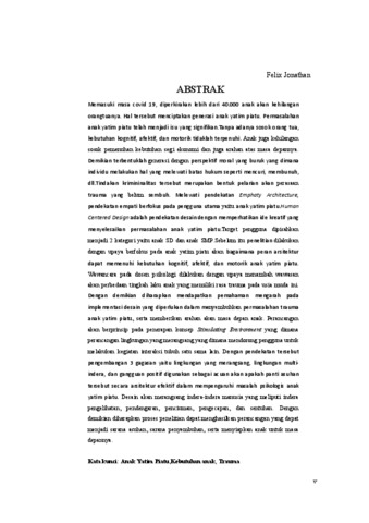 Memasuki masa covid 19, diperkirakan lebih dari 40.000 anak akan kehilangan orangtuanya. Hal tersebut menciptakan generasi anak yatim piatu. Permasalahan anak yatim piatu telah menjadi isu yang signifikan. Tanpa adanya sosok orang tua, kebutuhan kognitif, afektif, dan motorik tidaklah terpenuhi. Anak juga kehilangan sosok pemenuhan kebutuhan segi ekonomi dan juga arahan atas masa depannya. Demikian terbentuklah generasi dengan perspektif moral yang buruk yang dimana individu melakukan hal yang melewati batas hukum seperti mencuri, membunuh, dll. Tindakan krimininalitas tersebut merupakan bentuk pelarian akan perasaan trauma yang belum sembuh. Melewati pendekatan Emphaty Architecture, pendekatan empati berfokus pada pengguna utama yaitu anak yatim piatu.Human Centered Design adalah pendekatan desain dengan memperhatikan ide kreatif yang menyelesaikan permasalahan anak yatim piatu.Target pengguna dipisahkan menjadi 2 kategori yaitu anak SD dan anak SMP.Sebelum itu penelitian dilakukan dengan upaya berfokus pada anak yatim piatu akan bagaimana peran arsitektur dapat memenuhi kebutuhan kognitif, afektif, dan motorik anak yatim piatu. Wawancara pada dosen psikologi dilakukan dengan upaya menambah wawasan akan perbedaan tingkah laku anak yang memiliki rasa trauma pada usia muda ini. Dengan demikian diharapkan mendapatkan pemahaman mengarah pada implementasi desain yang diperlukan dalam menyembuhkan permasalahan trauma anak yatim piatu, serta memberikan arahan akan masa depan anak. Perancangan akan berprinsip pada penerapan konsep Stimulating Environment yang dimana perancangan lingkungan yang merangsang yang dimana mendorong pengguna untuk melakukan kegiatan interaksi tubuh satu sama lain. Dengan pendekatan tersebut pengembangan 3 gagasan yaitu lingkungan yang merangsang, lingkungan multi- indera, dan gangguan positif digunakan sebagai acuan akan apakah panti asuhan tersebut secara arsitektur efektif dalam mempengaruhi masalah psikologis anak yatim piatu. Desain akan merangsang indera-indera manusia yang meliputi indera pengelihatan, pendengaran, penciuman, pengecapan, dan sentuhan. Dengan demikian diharapkan proses penelitian dapat menghasilkan perancangan yang dapat menjadi sarana asuhan, sarana penyembuhan, serta menyiapkan anak untuk masa depannya. Kata kunci: Anak Yatim Piatu,Kebutuhan anak, Trauma