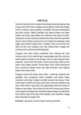 Jumlah anak jalanan semakin meningkat seiring dengan adanya pembangunan yang kurang merata di DKI Jakarta sehingga sarana pendidikan terbatas bagi kalangan tertentu. Kurangnya sarana pendidikan menyebabkan kebutuhan pendidikannyayang tidak terpenuhi. Masalah pendidikan anak jalanan berkaitan erat dengan kegiatan anak jalanan yang sebagian besar dilakukan untuk bekerja di jalanan. Seorang anak menjadi anak jalanan disebabkan oleh faktor eksternal berupa faktor ekonomi untuk membantu orang tuanya mencari nafkah serta lingkungan tempat tinggal yang berdekatan dengan jalanan. Sedangkan, faktor internal berasal dari dalam diri anak, yaitu kurangnya minat anak terhadap belajar sehingga anak cenderung lebih memilih bekerja dibanding belajar. Kurangnya minat dalam belajar menyebabkan anak cenderung sulit untuk menerima materi. Hal ini diatasi dengan mengembangkan bakat dan minat anak melalui kegiatan di bidang seni dan olahraga. Selain itu, adanya kegiatan belajar yang dapat menarik anak untuk belajar melalui konsep belajar sambil bermain dengan media dinding interaktif. Konsep belajar terkait metode pembelajaran secara interaktif dan adaptif, dimana anak dapat berinteraksi secara langsung dengan media belajar tersebut. Kurangnya antusias anak jalanan dalam belajar mendorong terciptanya suatu pandangan untuk memperbaiki kualitas pendidikan anak jalanan dengan menariknya untuk belajar sekaligus mewadahi komunitas anak jalanan. Sarana tersebut dapat mewadahi anak jalanan untuk dapat memperoleh pendidikan yang layak melalui fasilitas ruang belajar dan pengembangan bakat dan minatnya di bidang seni dan olahraga. Sarana edukasi ini terdiri atas komunitas yang bertujuan untuk mempererat hubungan antara anak jalanan dengan kalangan non anak jalanan karena sifatnya yang terbuka bagi seluruh kalangan sosial masyarakat sehingga dapat mengurangi kesenjangan sosial. Kata kunci : anak jalanan; arsitektur empati; komunitas; pendidikan