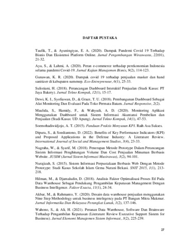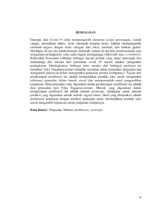 Dampak dari Covid-19 telah mempengaruhi ekonomi secara perorangan, rumah tangga, perusahaan mikro, kecil, menegah maupun besar, bahkan mempengaruhi ekonomi negara dengan skala cakupan dari lokal, nasional, dan bahkan global. Meskipun di satu sisi perekonomian melemah, namun di sisi lain, perekonomian juga mengalami peningkatan, yaitu pada bagian perdagangan elektronik atau e-commerce. Kebutuhan konsumen terhadap berbagai macam produk yang dapat mencegah dan melindungi diri mereka dari penularan covid 19 seperti masker mengalami peningkatan. Meningkatnya berbagai jenis masker dari berbagai produsen ini membuat Toko Nagamasyurmart memiliki kesulitan untuk memantau penjualan dan mengambil keputusan dalam memprediksi penjualan produk kedepannya. Tujuan dari perancangan dashboard ini adalah memudahkan pemilik toko untuk mengetahui informasi penjualan dalam bentuk visual dan mempermudah untuk pengambilan keputusan. Data penjualan yang digunakan dalam perancangan dashboard ini adalah data penjualan dari Toko Nagamasyurmart. Metode yang digunakan dalam perancangan dashboard ini adalah metode prototype, sedangkan untuk metode prediksi yang digunakan adalah metode regresi linear. Hasil yang didapatkan adalah dashboard penjualan dengan prediksi penjualan untuk memudahkan pemilik toko untuk mengambil keputusan untuk penjualan selanjutnya. Kata Kunci : Penjualan, Masker, dashboard, prototype