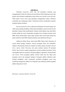 Teknologi Augmented reality atau AR merupakan teknologi yang menggabungkan benda dua dimensi atau tiga dimensi dalam lingkungan nyata tiga dimensi dan kemudian menghasilkan benda-benda maya tersebut secara real time. Tidak seperti virttual reality yang sepenuhnya menggantikan realitas, AR hanya menambah atau melengkapi realitas. Teknologi ini harus memfasilitasi interaksi pengguna dengan komputer. Saat ini Augmented reality sudah banyak diterapkan di banyak bidang, dan salah satunya bidang pendidikan. Dalam dunia pendidikan, Augmented Reality bisa digunakan sebagai sarana pembelajaran. Sebagai contoh aplikasi yang akan dibuat peneliti adalah alat untuk mengenalkan perangkat keras komputer kepada murid SMK. Hal ini dimaksudkan supaya dapat menarik minat murid dalam belajar dan dapat membantu murid lebih mengerti pelajaran yang dijelaskan oleh guru. Aplikasi ini dibuat khusus untuk murid SMK Cahaya Sakti, khususnya di jurusan teknik jaringan komputer, rekayasa perangkat lunak, dan multimedia. Aplikasi AR pengertian hardware komputer ini dibuat dengan memakai software Unity, vuforia, Adobe Photoshop, dan untuk membuat animasi 3D memakai Blender dan Autodesk, dengan menggunakan metode perubahan geometrik. Untuk menampilkan hardware komputer 3D pada handphone, diperlukan sebuah penanda atau marker. Proses pengujian aplikasi tersebut terdiri dari dua tahap yaitu pengujian sistem dan pengujian lapangan. Pengujian aplikasi dilakukan pada berbagai handphone untuk menentukan spesifikasi handphone mana yang mendukung penggunaan aplikasi ini. Pengujian yang dilakukan adalah pengujian aplikasi langsung ke murid. Kata kunci : Augmented Reality, Virtual 3D