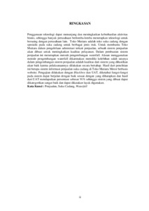 Penggunaan teknologi dapat menunjang dan meningkatkan keberhasilan aktivitas bisnis, sehingga banyak perusahaan berlomba-lomba menerapkan teknologi untuk bersaing dengan perusahaan lain. Toko Mutiara adalah toko suku cadang dengan spesialis pada suku cadang untuk berbagai jenis truk. Untuk membantu Toko Mutiara dalam pengelolaan admistrasi terkait penjualan, sebuah sistem penjualan akan dibuat untuk meningkatkan kualitas pelayanan. Dalam pembuatan sistem penjualan ini menerapkan metode pengembangan waterfall. Alasan menggunakan metode pengembangan waterfall dikarenakan memiliki kelebihan salah satunya dalam pengembangan sistem penjualan adalah kualitas dari sistem yang dihasilkan akan baik karena pelaksanaannya dilakukan secara bertahap. Hasil dari penelitian ini berupa sistem informasi penjualan suku cadang di Toko Mutiara Motor berbasis website. Pengujian dilakukan dengan Blackbox dan UAT, diketahui fungsi-fungsi pada sistem dapat berjalan dengan baik sesuai dengan yang diharapkan dan hasil dari UAT mendapatkan persentase sebesar 91% sehingga sistem yang dibuat dapat dikategorikan sangat baik dan dapat dikatakan layak digunakan. Kata Kunci : Penjualan, Suku Cadang, Waterfall