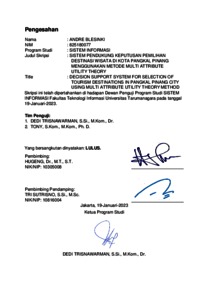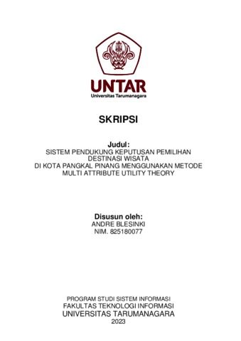 Blenski, Andre (2023) Sistem pendukung keputusan pemilihan destinasi wisata di kota Pangkal Pinang menggunakan metode multi attribute utility theory. Skripsi thesis, Universitas Tarumanagara.