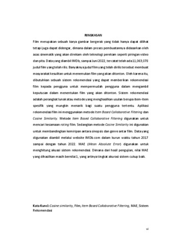 Film merupakan sebuah karya gambar bergerak yang tidak hanya dapat dilihat tetapi juga dapat didengar, dimana dalam proses pembuatannya didasarkan oleh asas sinematik yang akan direkam oleh teknologi perekam seperti piringan video dan pita. Data yang diambil IMDb, sampai Juni 2022, tercatat telah ada 11,063,078 judul film yang telah rilis. Banyaknya judul film yang telah dirilis tersebut membuat masyarakat kesulitan untuk menemukan film yang akan ditonton. Oleh karena itu, dibutuhkan sebuah sistem rekomendasi yang dapat memberikan rekomendasi film kepada pengguna untuk mempermudah pengguna dalam mengambil keputusan dalam menentukan film yang akan ditonton. Sistem rekomendasi adalah perangkat lunak atau metode yang menghasilkan usulan berupa item-item spesifik yang mungkin menarik bagi suatu pengguna tertentu. Aplikasi rekomendasi film ini menggunakan metode Item Based Collaborative Filtering dan Cosine Similarity. Metode Item Based Collaborative Filtering digunakan untuk mencari kesamaan rating film. Sedangkan metode Cosine Similarity ini digunakan untuk membandingkan kemiripan antara sinopsis dan genre antar film. Data yang digunakan diambil melalui website IMDb.com dalam kurun waktu tahun 2017 sampai dengan tahun 2022. MAE (Mean Absolute Error) digunakan untuk menghitung akuasi sistem rekomendasi. Dimana dari hasil pengujian, nilai MAE yang dihasilkan masih bernilai 1, yang artinya tingkat akurasi sistem cukup baik. Kata Kunci: Cosine similarity, Film, Item Based Collaborative Filtering, MAE, Sistem Rekomendasi