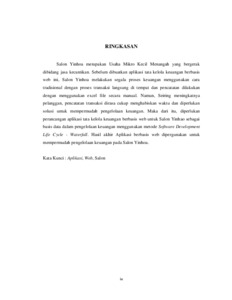 Salon Yinhoa merupakan Usaha Mikro Kecil Menangah yang bergerak dibidang jasa kecantikan. Sebelum dibuatkan aplikasi tata kelola keuangan berbasis web ini, Salon Yinhoa melakukan segala proses keuangan menggunakan cara tradisional dengan proses transaksi langsung di tempat dan pencatatan dilakukan dengan menggunakan excel file secara manual. Namun, Seiring meningkatnya pelanggan, pencatatan transaksi dirasa cukup menghabiskan waktu dan diperlukan solusi untuk mempermudah pengelolaan keuangan. Maka dari itu, diperlukan perancangan aplikasi tata kelola keuangan berbasis web untuk Salon Yinhao sebagai basis data dalam pengelolaan keuangan menggunakan metode Software Development Life Cycle - Waterfall. Hasil akhir Aplikasi berbasis web dipergunakan untuk mempermudah pengelolaan keuangan pada Salon Yinhoa. Kata Kunci : Aplikasi, Web, Salon
