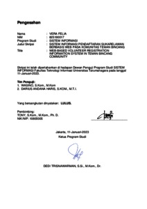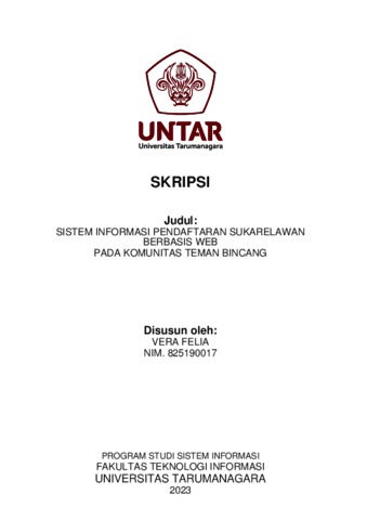 Felia, Vera (2023) Sistem informasi pendaftaran sukarelawan berbasis web pada komunitas teman bincang. Skripsi thesis, Universitas Tarumanagara.