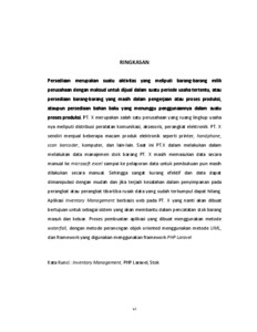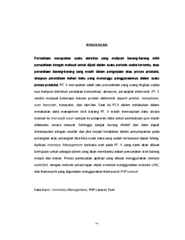 Persediaan merupakan suatu aktivitas yang meliputi barang-barang milik perusahaan dengan maksud untuk dijual dalam suatu periode usaha tertentu, atau persediaan barang-barang yang masih dalam pengerjaan atau proses produksi, ataupun persediaan bahan baku yang menunggu penggunaannya dalam suatu proses produksi. PT. X merupakan salah satu perusahaan yang ruang lingkup usaha nya meliputi distribusi peralatan komunikasi, aksesoris, perangkat elektronik. PT. X sendiri menjual beberapa macam produk elektronik seperti printer, handphone, scan barcoder, komputer, dan lain-lain. Saat ini PT.X dalam melakukan dalam melakukan data manajemen stok barang PT. X masih memasukan data secara manual ke microsoft excel sampai ke pelaporan data untuk pembukuan pun masih dilakukan secara manual. Sehingga sangat kurang efektif dan data dapat dimanipulasi dengan mudah dan jika terjadi kesalahan dalam penyimpanan pada perangkat atau perangkat tiba-tiba rusak data yang sudah terkumpul dapat hilang. Aplikasi Inventory Management berbasis web pada PT. X yang nanti akan dibuat bertujuan untuk sebagai sistem yang akan membantu dalam pencatatan stok barang masuk dan keluar. Proses pembuatan aplikasi yang dibuat menggunakan metode waterfall, dengan metode perancngan objek oriented menggunakan metode UML, dan framework yang digunakan menggunakan framework PHP Laravel Kata Kunci : Inventory Management, PHP Laravel, Stok
