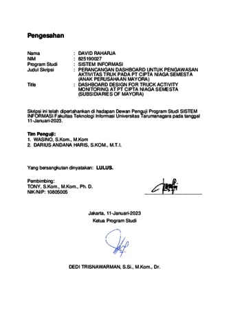 Raharja, David (2023) Perancangan dashboard untuk pengawasan aktivitas truk pada PT Cipta Niaga Semesta (anak perusahaan Mayora). Skripsi thesis, Universitas Tarumanagara.