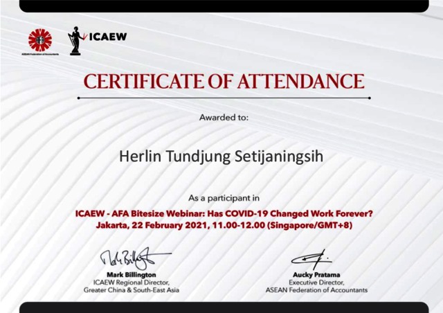 Herlin Tundjung S, Herlin Tundjung S (2021) 2021 As a Participant in ICAEW - AFA Bitisize Webinar Has COVID-19 Changed Work Forever. 2021 As a Participant in ICAEW - AFA Bitisize Webinar Has COVID-19 Changed Work Forever.