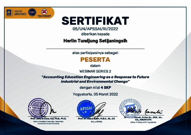 Herlin Tundjung S, Herlin Tundjung S (2023) 2022 Peserta dalam WEBINAR SERIES 2 Accounting Education Engineering as a Response to Future Industrial and Environmental Change. 2022 Peserta dalam WEBINAR SERIES 2 Accounting Education Engineering as a Response to Future Industrial and Environmental Change.